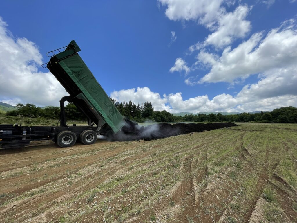 飯山市の処理施設では365日ほぼ毎日、原料となる廃棄物を受入、肥料製品が出来上がるまでに最短でも50日以上かけて処理をし、主に長野県内の農家様に配達しています。